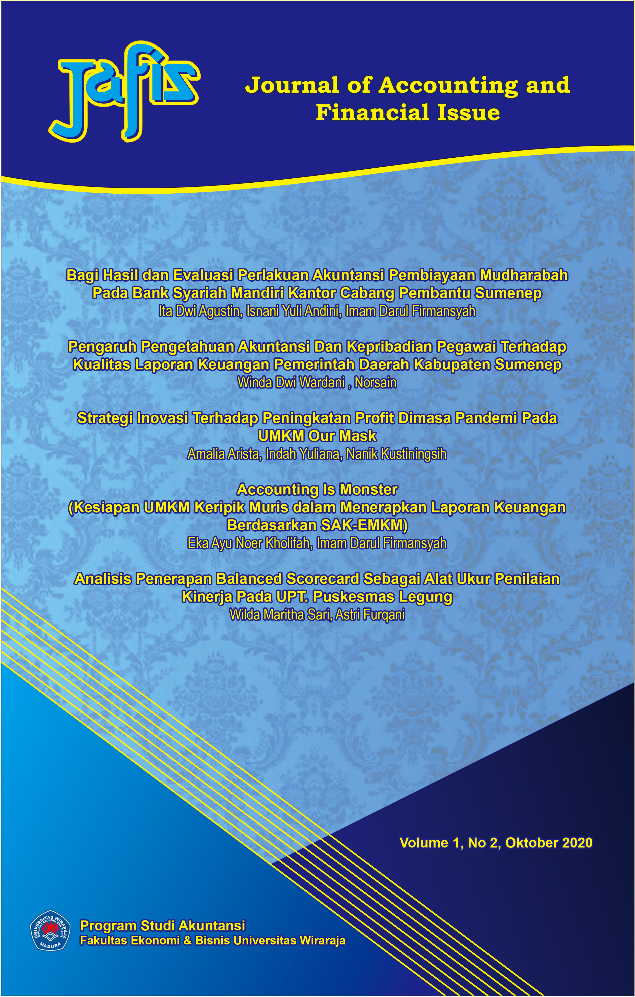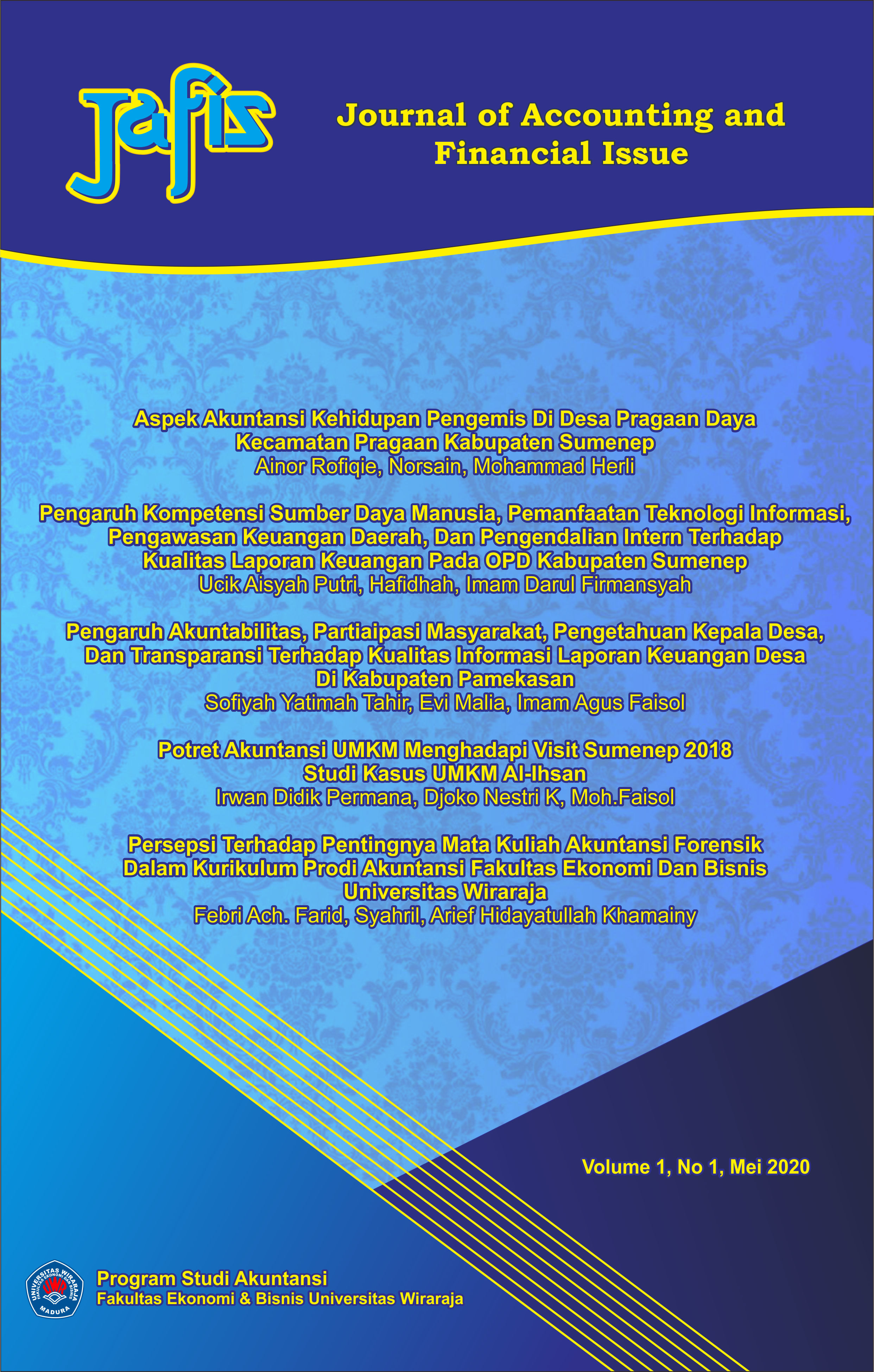 Vol 1 No 2 (2020)Journal of Accounting and Financial Issue (JAFIS) adalah jurnal yang diterbitkan oleh Program Studi Akuntansi Fakultas Ekonomi dan Bisnis Universitas Wiraraja dengan memuat publikasi di bidang akuntansi dan keuangan yang meliputi akuntansi keuangan dan pasar modal, akuntansi manajemen dan biaya, akuntansi syariah, akuntansi keperilakuan, pemeriksaan akuntansi, sistem informasi akuntansi, etika profesi akuntansi, perpajakan, dan tata kelola (good governance) yang merupakan hasil penelitian. Jurnal ini diterbitkan secara berkala setiap enam bulan sekali (dua kali dalam setahun), yaitu pada bulan Mei dan Oktober.