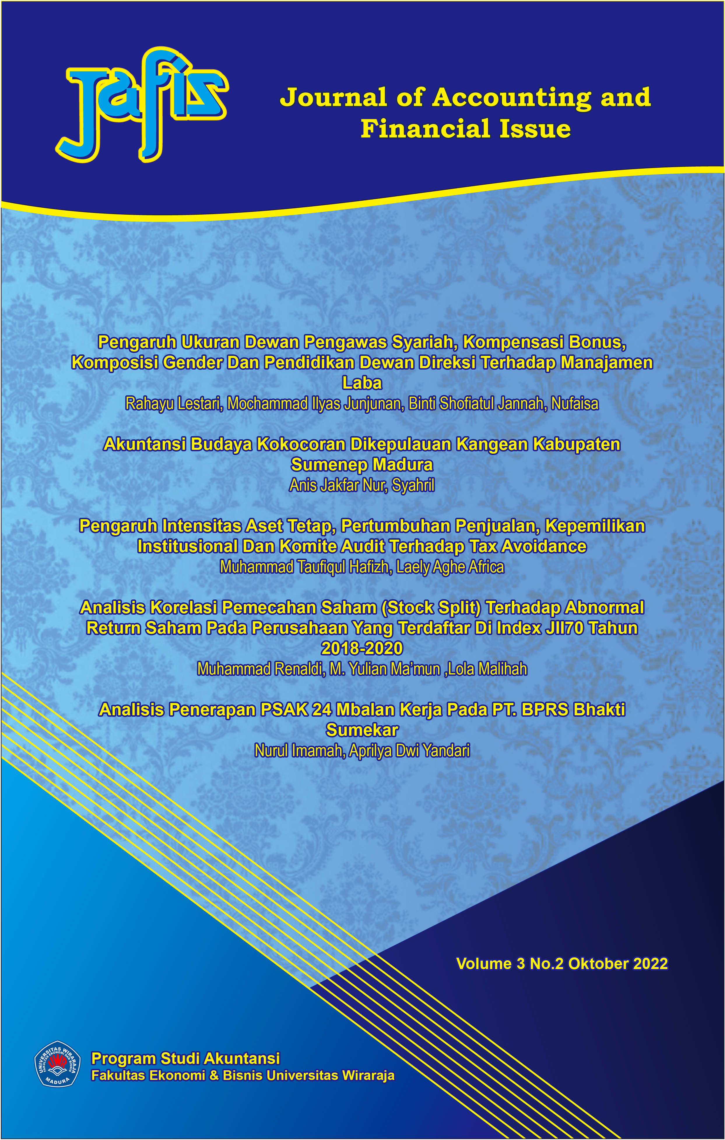 Vol 3 No 2 (2022)Journal of Accounting and Financial Issue (JAFIS) adalah jurnal yang diterbitkan oleh Program Studi Akuntansi Fakultas Ekonomi dan Bisnis Universitas Wiraraja dengan memuat publikasi di bidang akuntansi dan keuangan yang meliputi akuntansi keuangan dan pasar modal, akuntansi manajemen dan biaya, akuntansi syariah, akuntansi keperilakuan, pemeriksaan akuntansi, sistem informasi akuntansi, etika profesi akuntansi, perpajakan, dan tata kelola (good governance) yang merupakan hasil penelitian. Jurnal ini diterbitkan secara berkala setiap enam bulan sekali (dua kali dalam setahun), yaitu pada bulan Mei dan Oktober.
