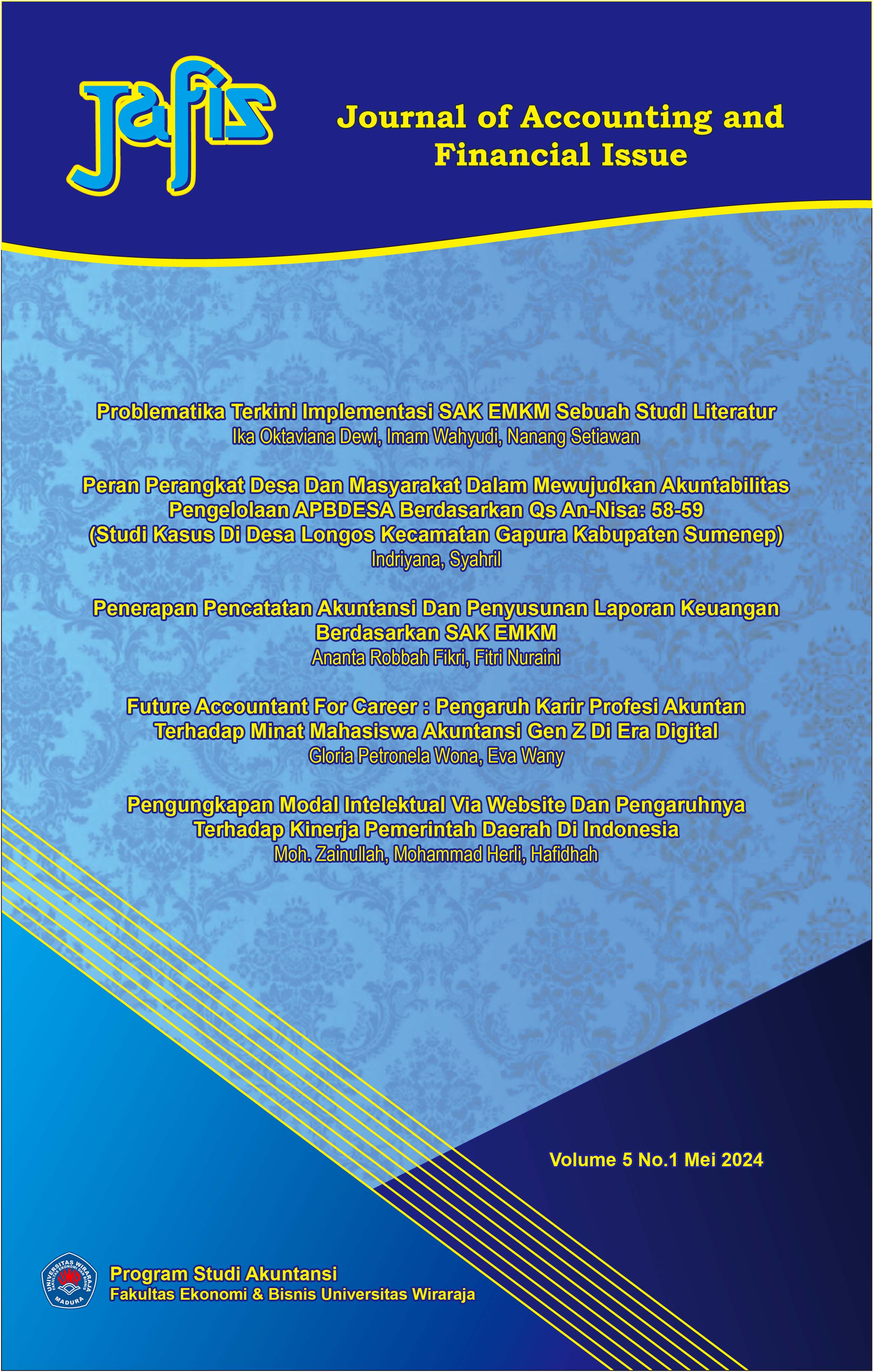 Vol 6 No 1 (2025)Journal of Accounting and Financial Issue (JAFIS) adalah jurnal yang diterbitkan oleh Program Studi Akuntansi Fakultas Ekonomi dan Bisnis Universitas Wiraraja dengan memuat publikasi di bidang akuntansi dan keuangan yang meliputi akuntansi keuangan dan pasar modal, akuntansi manajemen dan biaya, akuntansi syariah, akuntansi keperilakuan, pemeriksaan akuntansi, sistem informasi akuntansi, etika profesi akuntansi, perpajakan, dan tata kelola (good governance) yang merupakan hasil penelitian. Jurnal ini diterbitkan secara berkala setiap enam bulan sekali (dua kali dalam setahun), yaitu pada bulan Mei dan Oktober.