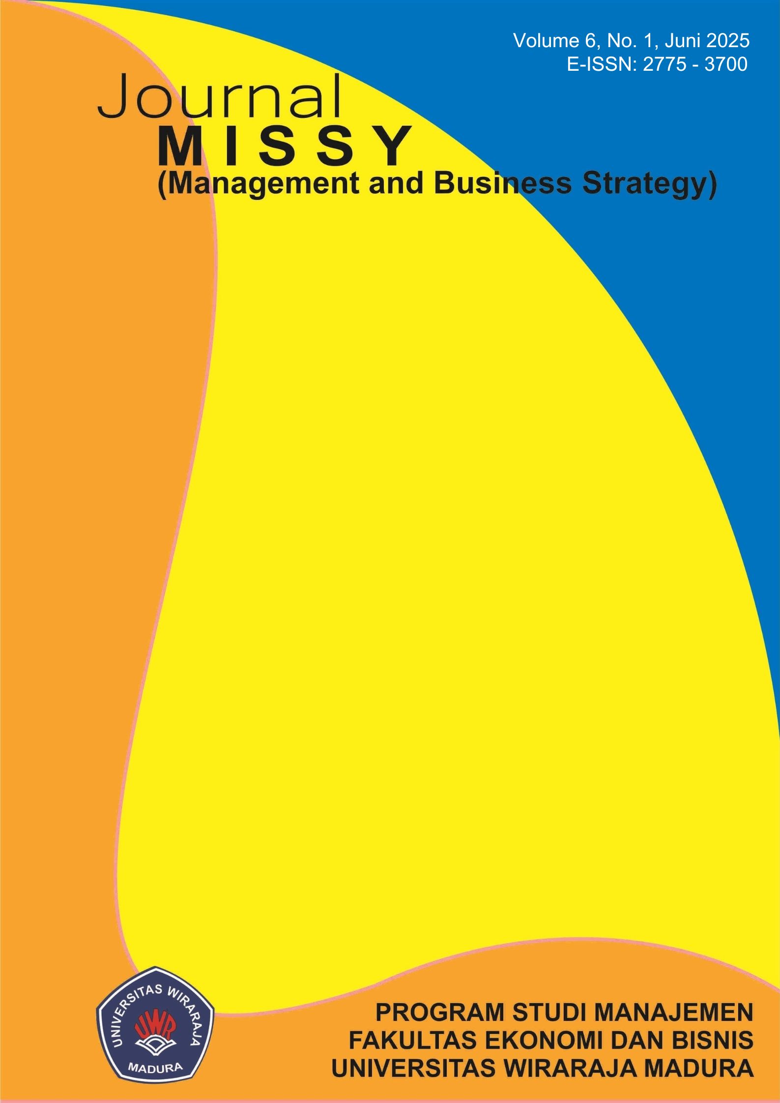 Vol 5 No 1 (2024)JOURNAL MISSY (Management and Business Strategy) diterbitkan secara berkala oleh Program Studi Manajemen Fakultas Ekonomi dan Bisnis Universitas Wiraraja Madura sebagai media dalam mempublikasin hasil penelitian. Tim Redaksi menerima naskah tulisan ilmiah yang belum pernah diterbitkan dalam jurnal ilmiah lain baik dalam maupun luar negeri. Naskah yang dimuat merupakan hasil karya asli penulis dan pihak redaksi tidak bertanggung jawab atas isi dari naskah hasil penulis. Tim Redaksi dapat menerima,menolak, atau mengadakan koreksi tanpa merubah isi dari tulisan.